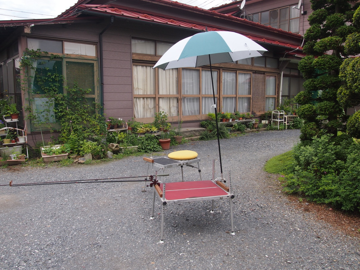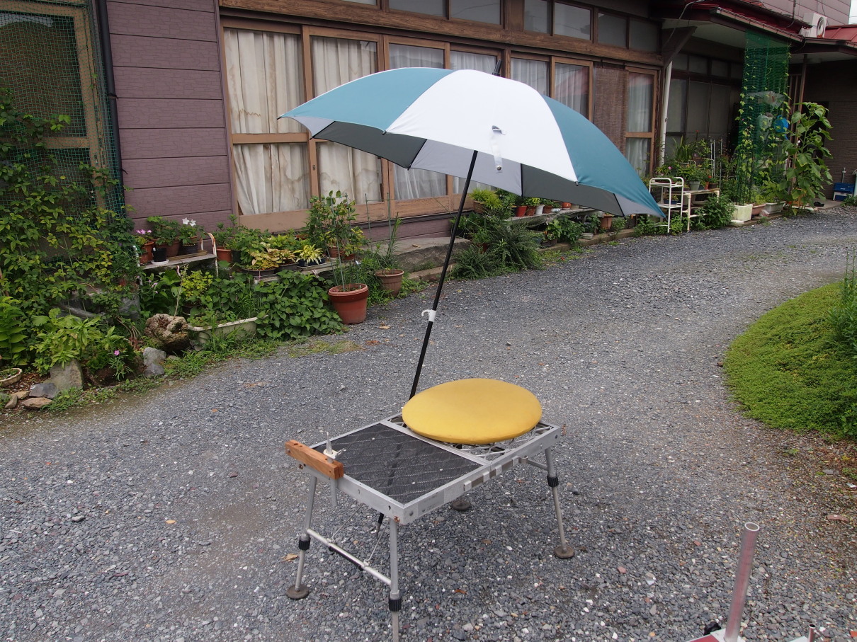 とりあえず、SKMくんに借りたパラソルをヘラ台に設置してみた。